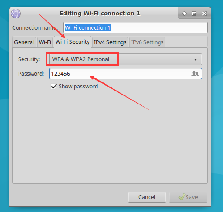 Select Wi-Fi Security, set the Security option to WPA & WPA2 Personal, and enter the Wi-Fi password in the Password field.