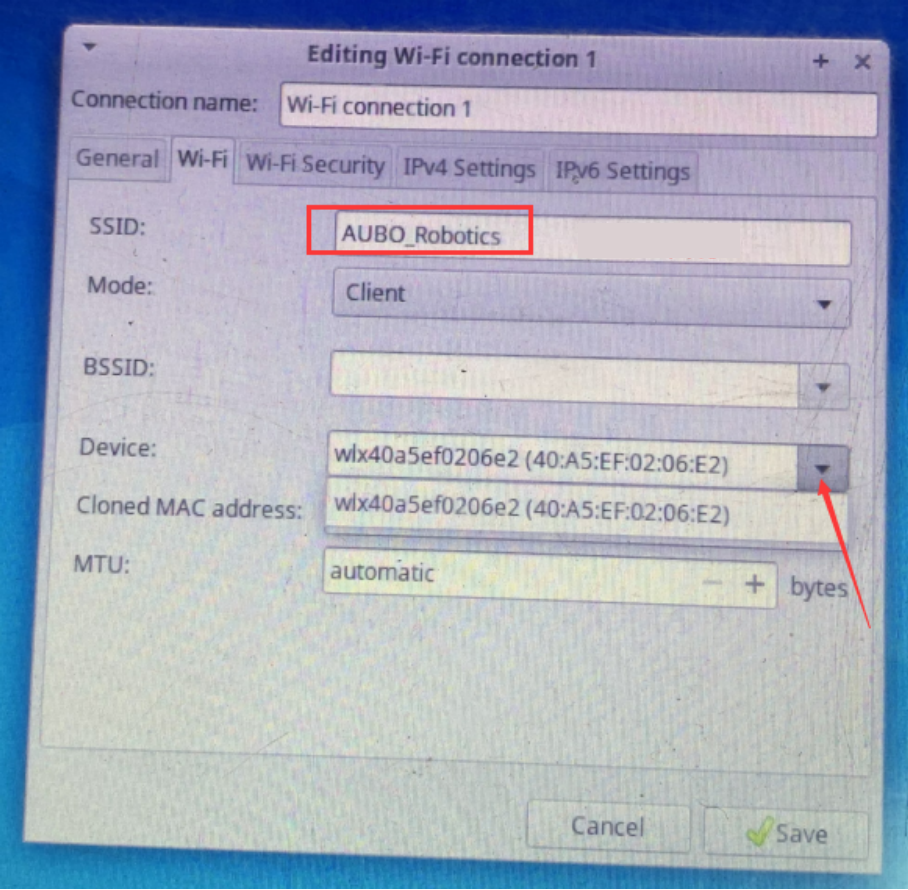 AUBO_Roboticsas shown in the example), and select the device address in the Device field. If no device addresses appear in the dropdown menu, it indicates the wireless network card has not successfully connected.
