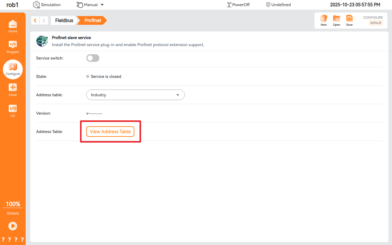 If the address table is not displayed in Configuration - Fieldbus - Profinet, modify the configuration file /root/arcs_ws/config/aubo_scope.ini and configure the field profinet_address_enabled=true under system, save the configuration and restart the ARCS, and then, the address table will be displayed.