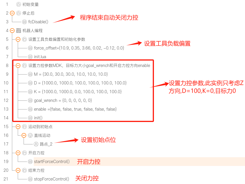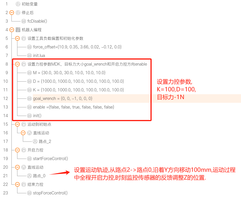 实例说明 : 在实例1演示的拖动中增加目标力 -5N,机械臂会受目标力影响,一直朝着能使目标力平衡的方向移动,直到受到相等的外力使机械臂达到平衡状态,机械臂停止运动。该实例中,目标力为 -5N,机械臂向下运动,直到给工具向上 5N 的外力使之达到平衡状态。