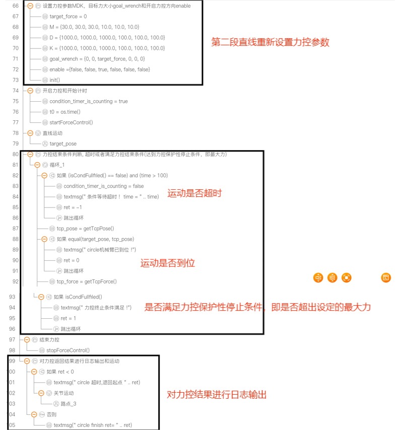 设置了最大力条件,力超过最大限制,满足 isCondFullfiled(),机械臂停止运动。