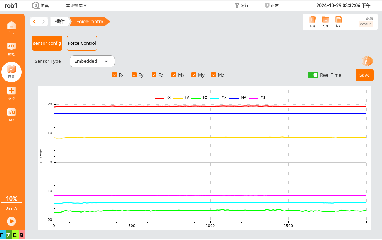 在“配置 > 插件 > 力控 > 传感器”配置界面可以査看实时的力控数据,如下所示,参考坐标系为上面②设置的坐标系。