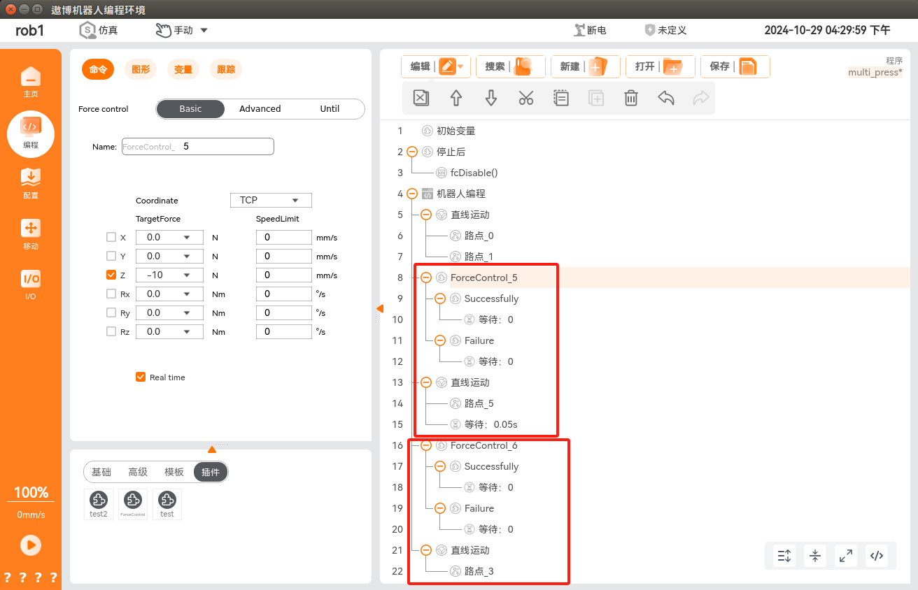在程序节点中添加力控条件,单击“编程 > 插件 > ForceControl”,即可添加力控条件,此条件分为力控条件配置和正常/异常退出力控条件后的流程实现。